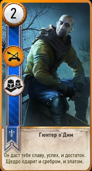 | 2 | Гюнтер о’Дим | Двойник (примечание: использование этой карты вызовет на поле все карты Гюнтер о’Дим: Тьма, однако сама эта карта не вызывается на игровое поле использованием карты Гюнтер о’Дим: Тьма) | Карта из дополнения «Каменные Сердца».Дается за победу над персонажем с аукциона в Доме Борсоди в ходе квеста «Сезам, откройся!». | |