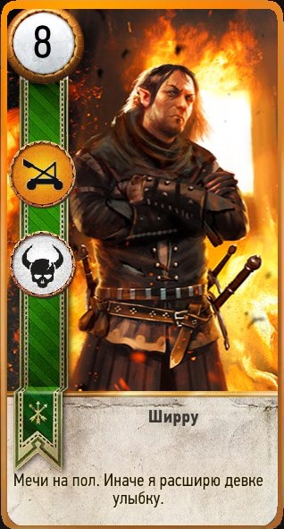 Ширру | 8 | Скоя’таэли | Награда за победу над торговцем в лагере циркачей, стоящим западнее поместья Вегельбудов | Обладает способностью «Казнь». Эффект действует только на карты осадного ряда |